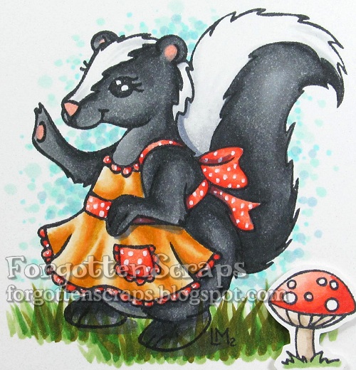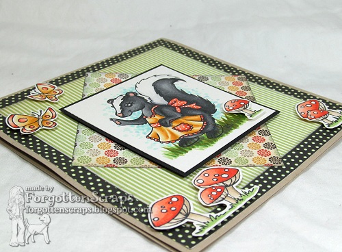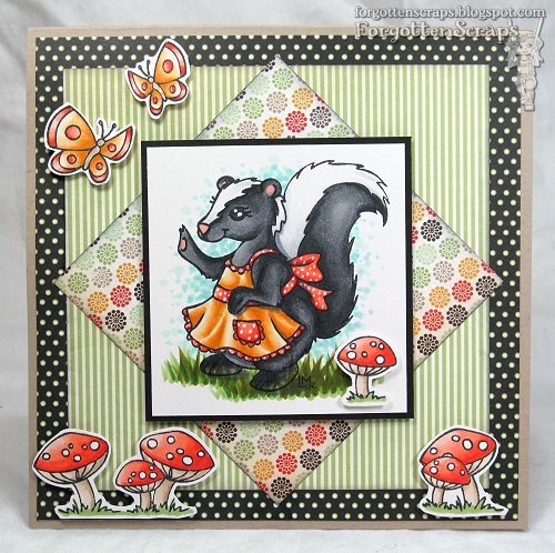 This card uses Forest Friends Sabina and some other accessory stamps from the Forest Friends line from Little Miss Muffet Stamps to create this scene. The colors I pulled from the papers and then used a simple design for the layout so that most of the colors would be focused on the image. With Sabina the skunk being black and white, the bright colors look vibrant, which I like. 😀