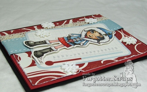 The image is Sonny Honeycloud Mistletoe rubber stamp from Little Miss Muffet Stamps and was drawn by Pollycraft.  I think this girl would be great in many other colors too and having the mistletoe on her hat is cute and makes for a great card front!  The recycling portion on here are the snowflakes which I had used once before in the summer – they were originally in a children’s cup, the ones that have a double lining with water in between.  These were the floaters and when the cup broke, I just couldn’t toss them in the rubbish.  LOL