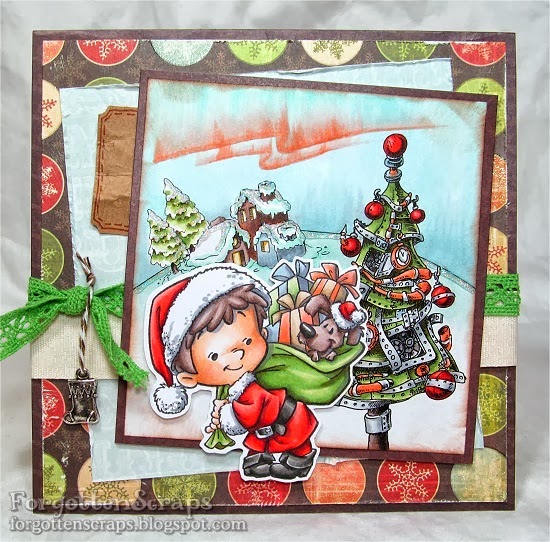 Lovely card, adorable image, that little dog looks very cheeky in the santa sack, the colouring is really fab 🙂 xxx