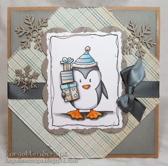 This is such a fun stamp to color and I wanted to go with something other than my Christmas papers.  I found this paper in my Mom’s stash and though it would be perfect.  The little bit of blue, green and gray still makes for a great winter card.  The chipboard snowflakes were kept raw for a rustic feel.