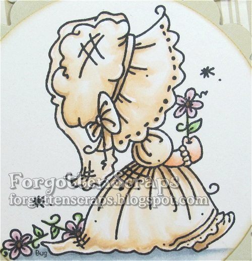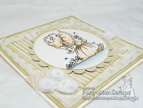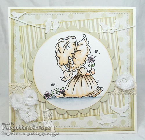 At Little Miss Muffet Challenges this fortnight we have a dainty challenge for you to take on and one that I always find difficult to master. The theme is “White on White” but you’re image can be colored if you want to add some color to your project. I’ve been wanting to use Fancy Sunbonnet Bride for a while and thought this is the perfect challenge to use on it. However, doing it completely white on stark white wasn’t what I was in the mood for. So I tweaked the colors a little into the cream spectrum and this is what I came up with…