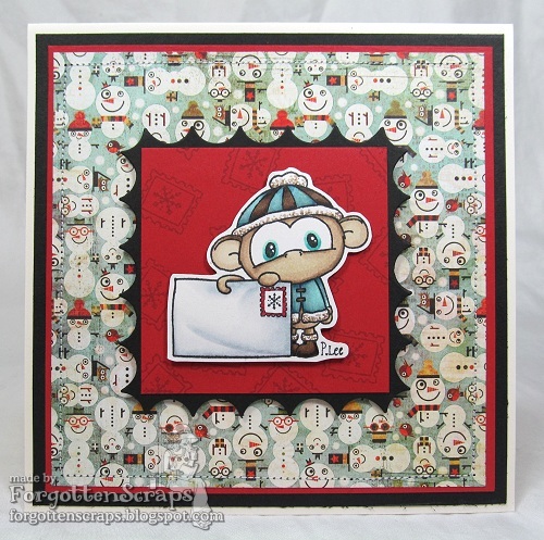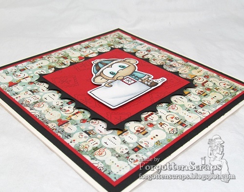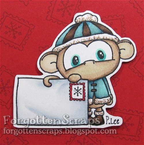 For my project I’ve used Letter Chester rubber stamp from Little Miss Muffet Stamps and drawn by Pollycraft.  The stamp also comes with a coordinating postage stamp and I used that on the red cardstock behind Chester.  Without it, the red was just a tad bit overbearing and I think the extra stamp helped tone that down.