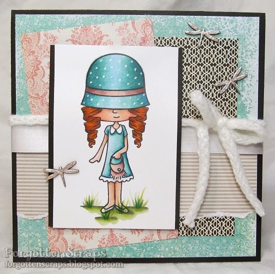 The image I used is Iris May Hatter from Little Miss Muffet Stamps and available in rubber.  She was stamped in black and colored with the Marvy Le Plume alcohol markers.  Then I added a few dragonfly chippies (from Make it Crafty) and covered them with liquid pearls.  Added some ribbon and tadah!