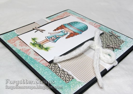 The image I used is Iris May Hatter from Little Miss Muffet Stamps and available in rubber.  She was stamped in black and colored with the Marvy Le Plume alcohol markers.  Then I added a few dragonfly chippies (from Make it Crafty) and covered them with liquid pearls.  Added some ribbon and tadah!