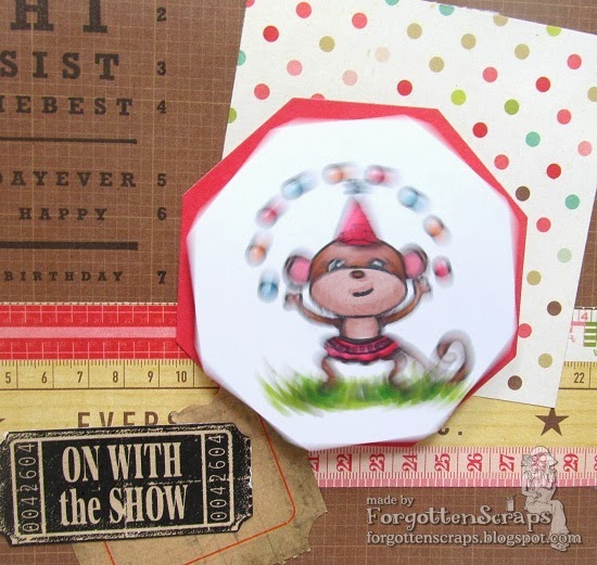 I want to share a card that I used a wiggling Wobble on. This on uses Imaginisce’s Animal Cracker Circus Monkey and I think the sentiment is from Stamping Up but if it is I haven’t an idea on the stamp set it came from.