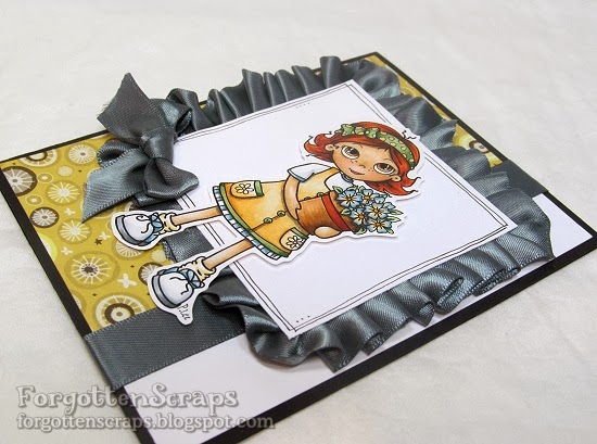 The image I used is Celeste Amberglow Flowerpot from Little Miss Muffet Stamps and drawn by Pollycraft.   She’d be perfect for a forget-me-not card, Mother’s Day or even a thinking of you card!  The card I created was trying to use up some of my scraps and I think I’m getting tired of those sheet – luckily I’m about the last one on this pack, if not the last one.  Yeah!