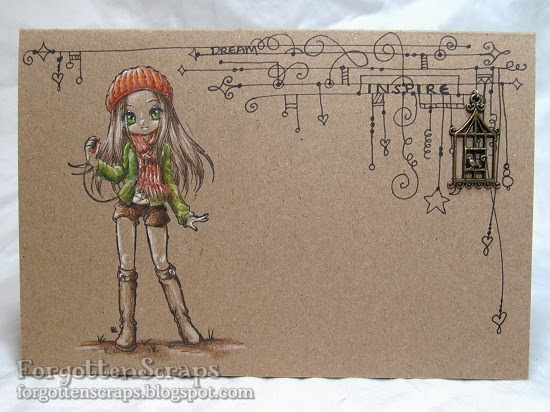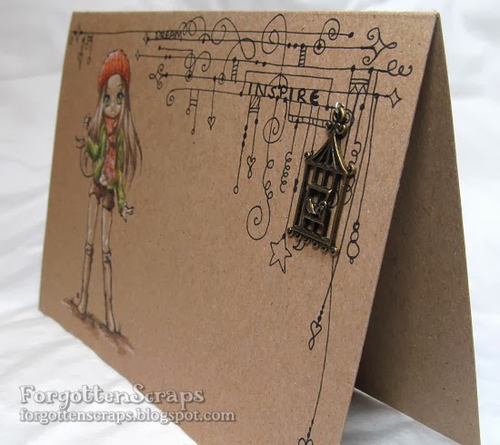 For the card, I decided a little bit of doodling would be fun and inspired by the Zentangle® method of pattern drawing. However, I kept it in the corner to balance out the character. Then for fun, I found a little bird cage charm and added that to the tangles. Thanks for coming by and I hope you have a great day!