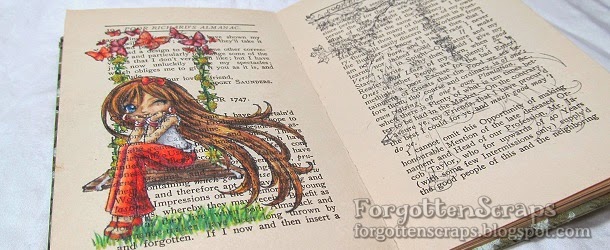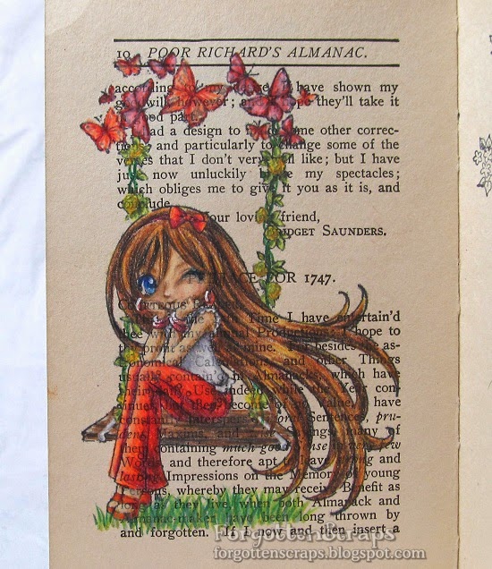 This is one of the most recent page I’ve colored in my travel journal but is the first one to be shown on my blog.  The stamps I used are Tress Winking and Spring Swing from Make it Crafty, both rubber stamps available at Little Miss Muffet Stamps.  I stamped then masked Tress Winking first before stamping the Spring Swing.  However, I wasn’t able to match up the swing very well so she was floating.  LOL  But I added some extra width to the swing so now she sits well.