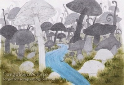 I used the forest example, from the challenge post, and tried to mimic the color of the trees. Using the back part as the most lightest then coming forward to a darker gray. But then at the foreground I started to make the mushrooms lighter. I was using all gray colors knowing that I was going to go back in and use colors.