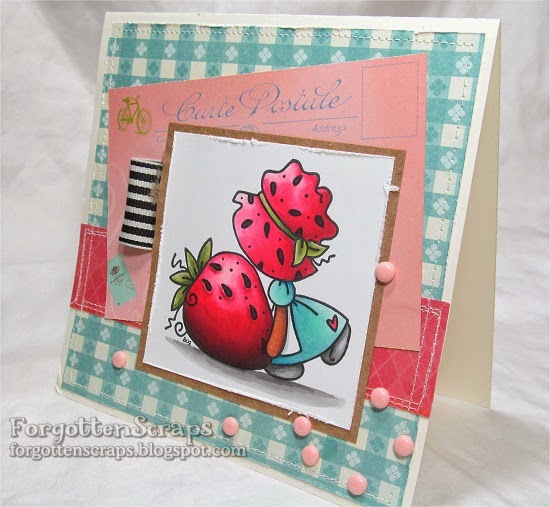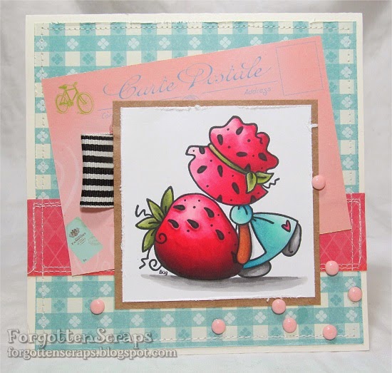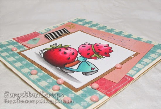 Sometimes the project is all about the colors for me and how they work together so I’m pleased at how this project turned out. I liked the combination of baby blue with pinks on this project. 🙂 The stamp I used is Sunbonnet Strawberry Big rubber stamp from Little Miss Muffet Stamps. The big strawberry gave me a chance to try coloring around the seeds giving the strawberry an edge. I was hoping the seeds would look more realistic but I think I reversed the shadow on the edge. LOL Well, I tried and that counts. 😀