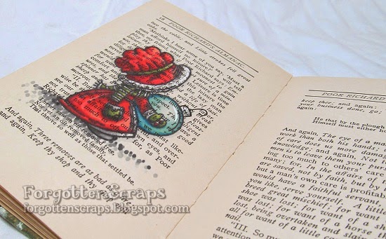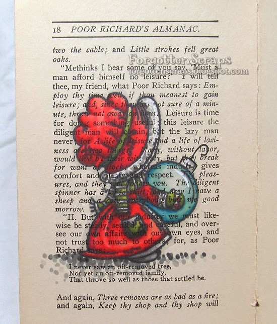 The image I used was Fancy Sunbonnet Winter Snowball from Little Miss Muffet Stamps which was stamped and colored in my travel journal. This time I colored the image with Marvy Le Plume markers. Most of the colors were easy to blend, surprisingly, but the red took some extra ink to blend from the darkest to the lightest. And as a result, the red bled through the paper and showed up on the other side. I’ve painted it with Gesso and will try to cover it up with another image so we’ll see how that works out.