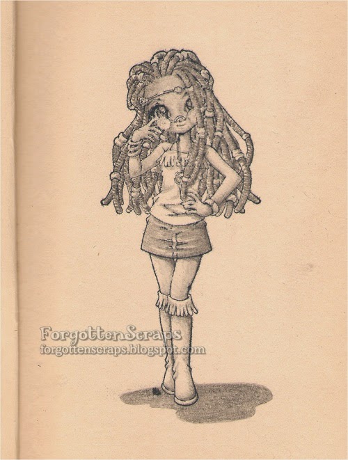 At the beginning of my travel journal I have a couple of blank pages to work with and this is one of them.  I stamped Desiree from Make it Crafty in black ink then colored it with a No.2 pencil.  It was the only thing I had with me at the moment and I haven’t actually colored a grey scale image for long a while.  By the way, I’m loving the MiC rubber stamps because I can use them on old books like this where a digital image can’t “go.”  😀