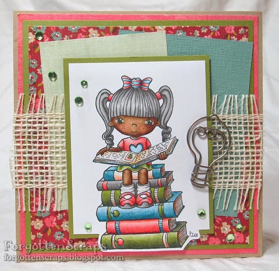 This image was colored using Copic markers then matted and placed on a 6″x6″ card. I used burlap looking ribbon for texture and a light bulb metal embellishment for fun. Sprinkle a few sparkling gems and this card is ready to be sent to an avid reader and fellow book lover.