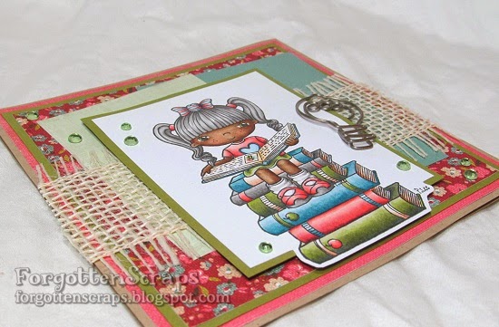 This image was colored using Copic markers then matted and placed on a 6″x6″ card. I used burlap looking ribbon for texture and a light bulb metal embellishment for fun. Sprinkle a few sparkling gems and this card is ready to be sent to an avid reader and fellow book lover.