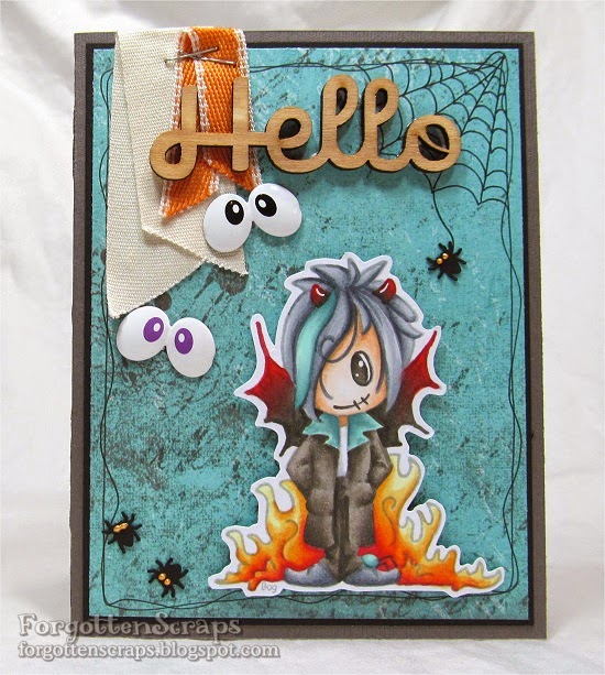 I reached into the back of the cabinet for some Halloween papers and spooky eyes to help embellish this card. Then A few things from around the table such as the ribbon, staples and Hello sentiment… and some spiders from my favorite tiny punches. Added some doodles and this little devil is ready so greet you in your mailbox! Thanks for dropping by and have a wonderful spooky weekend!