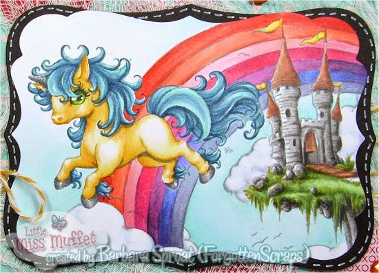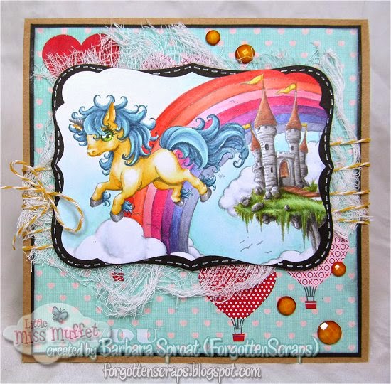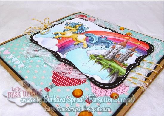 The images I used are Rainbow Castle and Baby Unicorn rubber stamps by Make it Crafty. I first stamped the unicorn and then masked it before stamping the rainbow. I delved into my Valentine stash to create the card but also added some yellow to tie in with the unicorn and then some twine to tie the project. He he he Hope you enjoy!