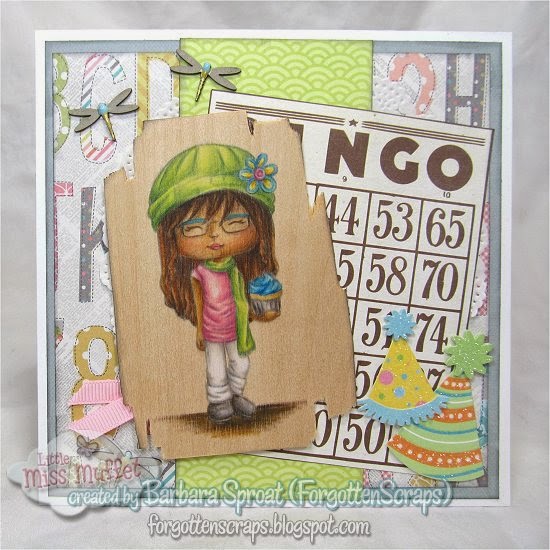 The image I used is Jr. Hatter Jocelyn from Little Miss Muffet Stamps.  I’ve stamped it on Balsa Wood with gray then colored it with my new Polychromos Pencils.  I also used Make it Crafty dragonflies chipboard embellishments.  The rest of the card was put together with odds and ends from around my crafting space.
