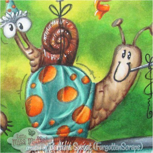 I finally finished it!  This is Jumbo Birthday Snails (which is a jumbo version of Belated Birthday Snails) from Little Miss Muffet Stamps – if you’ve been on Facebook, you might have seen my back story.  I had sent this image in to get a stamp created but it was in the middle of the night.  So when the magnesium plate came back, we discovered that I had accidentally ordered it at six inches large.  Whoops!  That was twice the size to was really suppose to be.  LOL.