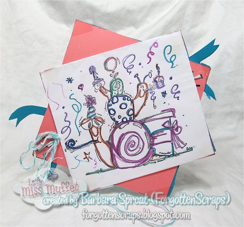 I wanted to go for a realistic whimsical look so I looked at snail photos to get an idea of the shell and snail.  The middle snail didn’t fit in this theme so I tried to make it look like it was covered with a blanket.  Then the streamers were widened and the background was suppose to look like distant foliage.  Lastly the ground was colored to look like a tree branch – at least, I hoped that’s what the looks like.