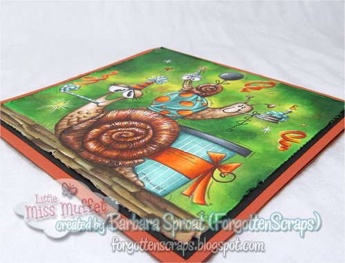 I finally finished it! This is Jumbo Birthday Snails (which is a jumbo version of Belated Birthday Snails) from Little Miss Muffet Stamps – if you’ve been on Facebook, you might have seen my back story. I had sent this image in to get a stamp created but it was in the middle of the night. So when the magnesium plate came back, we discovered that I had accidentally ordered it at six inches large. Whoops! That was twice the size to was really suppose to be. LOL.
