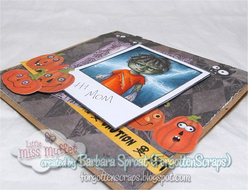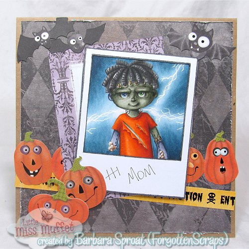 This is my Frankenstein creation – complete and alive on a card. I thought it would be fun to use the Lawn Fawn Polaroid stamp. Frankenstein was created from Sugar ‘n Spice Dolls Chili Pepper from Little Miss Muffet Stamps. For a limited time, you can get that stamp for free and give it a try yourself. Muah ha ha ha