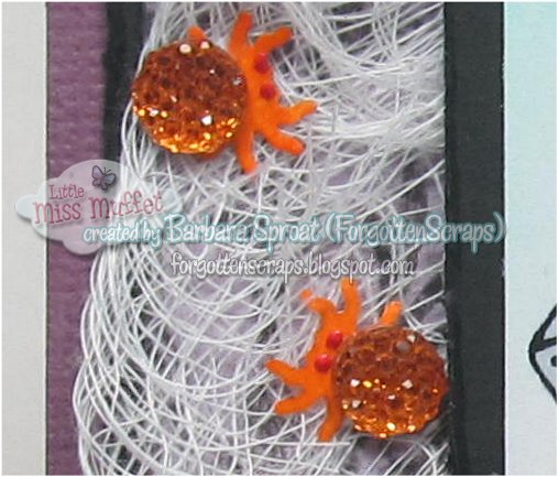 I had fun with the embellishments on this one.  My favorite are the spiders.  I’ve used the spider punch several times and added dots for eyes but this time I added the gem on the back.  It turned out to look more like a real spider – even though they are orange.  They’re so cute (well, at least I think they are) that I included a larger photo below.  Don’t get spooked!  LOL
