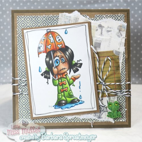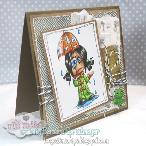 This is Skelekinz No Sunshine rubber stamp from Little Miss Muffet Stamps. Even though she is colored with vibrant colors, I wanted to make a gloomy card so I selected drab colors for the card base. If you look, my daughter helped me color it too … that’s the extra white gel pen on the umbrella. LOL