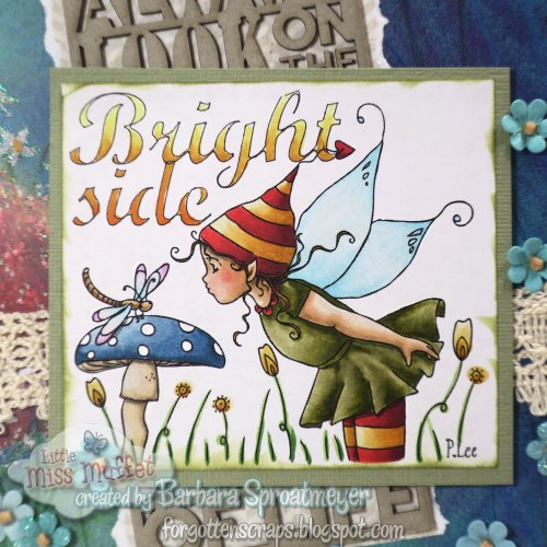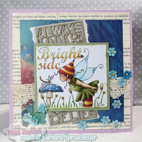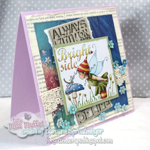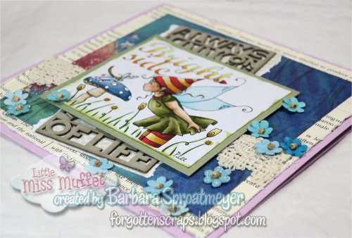 This is Clover Dancing with Dragonflies from Little Miss Muffet Stamps and I also used a Bright Side of Life chipboard sentiment from Make it Crafty. I always start thinking of the Life of Brian when I read this and no doubt, start singing it too. LOL