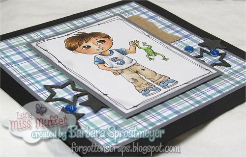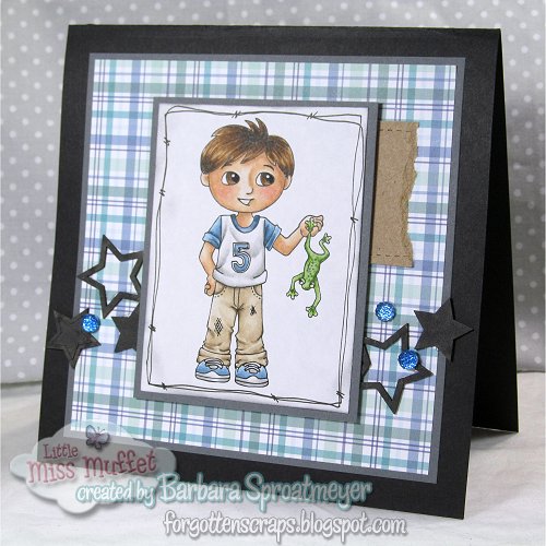 This is Bandit Boy Tom from Little Miss Muffet Stamps and was created for the Little Miss Muffet Challenge #141. I went with a quick card and used some Make it Crafty chipboard too – those are the stars and I colored them black with the Copic marker. The paper is from My Favorite Things and is from the wonderful Subtle Plaids paper pack. Head on over to the LMM Challenges and show us one of your creations.