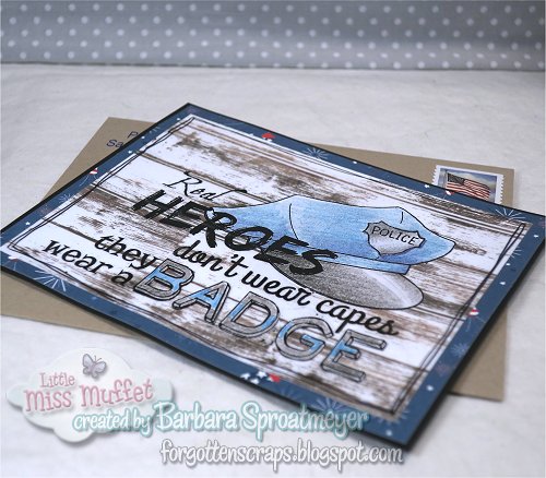 Come join the Sharing Handmade Kindness Challenge and show support for your law enforcement officers. LMMS joined Whimsy Stamps for the month of September to give thanks to our local police by sending them some cards. This is my first card and I merged the hat from To Serve and Protect with Real Heroes United Sentiment. Colored with colored pencils.