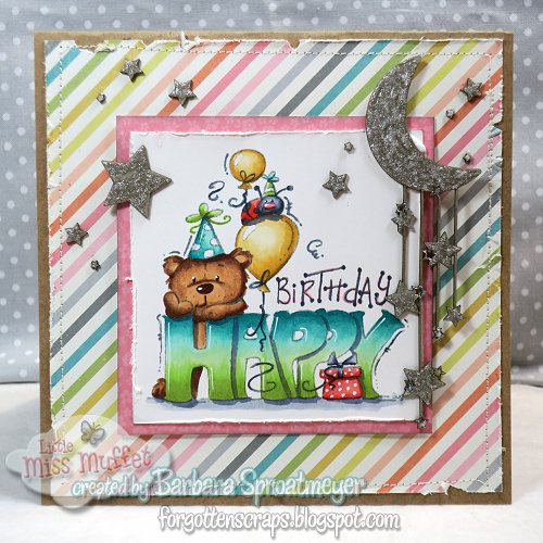 This card uses Theodore’s Birthday rubber stamp from Little Miss Muffet Stamps and I wanted to go for a bright and cheery look so I picked this rainbow paper. I had planned to add a maze on the front but cut the paper before I remembered so I switched up the layout and ended up with this.
