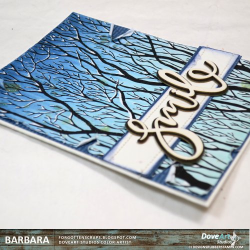 I’m getting ready for some snowing thoughts so I used the new Trees Silhouette from DoveArt Studios that was recently released and created my own snowy scene. The stamp was colored with the blues then I went back over the image with a white gel pen. Lastly, there was some sparkle spray that I tried out but it created blobs so I try to ignore those.
