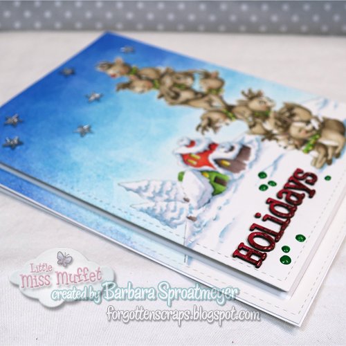 Hope you had a wonderful Christmas! For this project, I’ve used Stackers Reindeer by Art Impressions and in the background is Little Village by Make it Crafty (with some Chipboard Embellishments too). I stamped the reindeer and then used a mask to stamp the background. While the mask was still there, I used Distress Inks to do the background, Mermaid Lagoon and Blueprint Sketch. The sentiment was covered with Liquid Pearls.