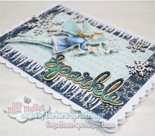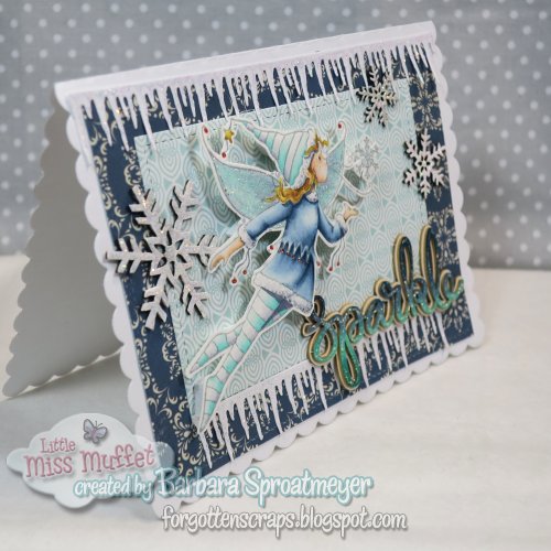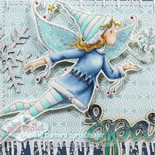 For my project today, I’ve used Clover Snowflake Kisses rubber stamp from Little Miss Muffet Stamps. For some of the accessories, I’ve used the Cutters Icicle Border metal die and some Make it Crafty chipboard embellishments. Then I piled on the Stickles glitter.