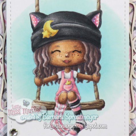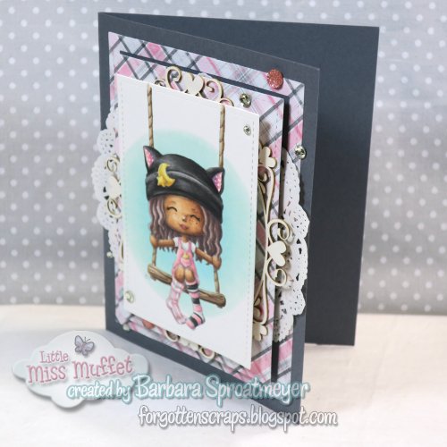 It’s Thursday at Little Miss Muffet Stamps and there is still time to add a project to the Anything Goes Challenge. For my project I’ve used Jr. Hatter Twinkle rubber stamp.  I created different layers on the card and behind the image layer, I used a Make it Crafty chipboard embellishment frame.