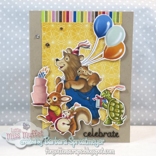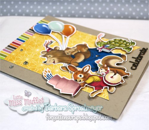 I’ve used the Birthday Memories designer series papers from Stampin’ Up! to create this project and followed an idea I got from the cake and banner in the SU promotional display. I also used some Make it Crafty chipboard embellishments for the sentiment and a couple gems for sparkle. This is one of my favorite cards from the series because I love all the animals on there.