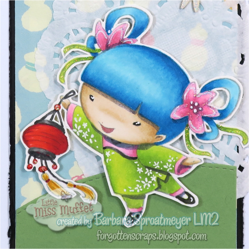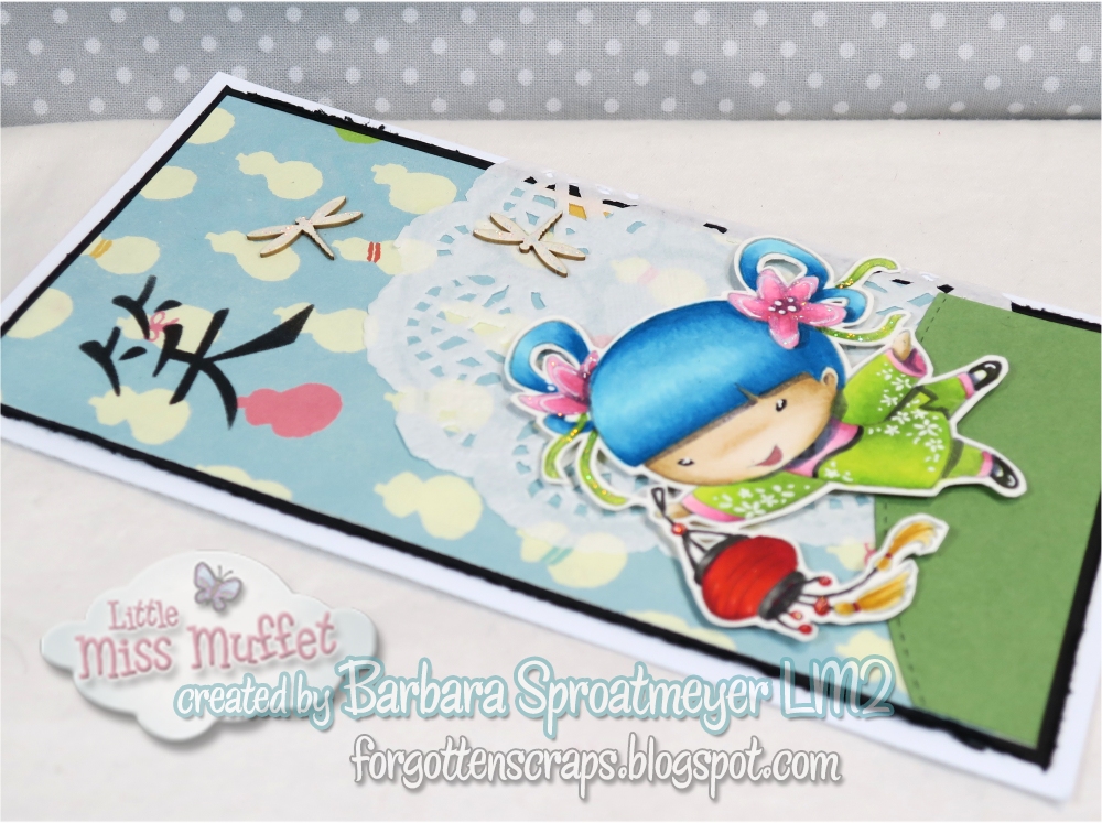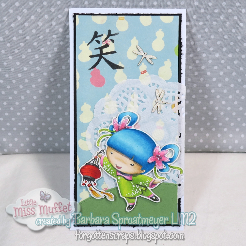 Here’s another bookmark I made and this one uses Mei Li from Sister Stamps. I used an envelope I found an Daiso while on a recent shopping spree. The sentiment is a cupcake stencil for “Laugh” and the dragonflies are Make it Crafty chipboard embellishments.