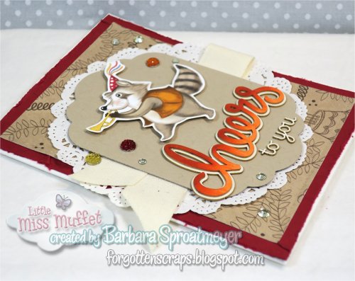 I’ve used the Birthday Memories designer series papers from Stampin’ Up! to create this project and followed a card layout by Kimberly Van Diepen. I also used some Make it Crafty chipboard embellishments for the sentiment and a couple gems for sparkle. Instead of using the chef, I used the raccoon from the paper series and centered it over the sentiment. I like the orange in this one.