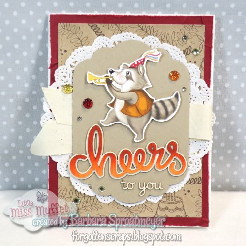 I’ve used the Birthday Memories designer series papers from Stampin’ Up! to create this project and followed a card layout by Kimberly Van Diepen. I also used some Make it Crafty chipboard embellishments for the sentiment and a couple gems for sparkle. Instead of using the chef, I used the raccoon from the paper series and centered it over the sentiment. I like the orange in this one.