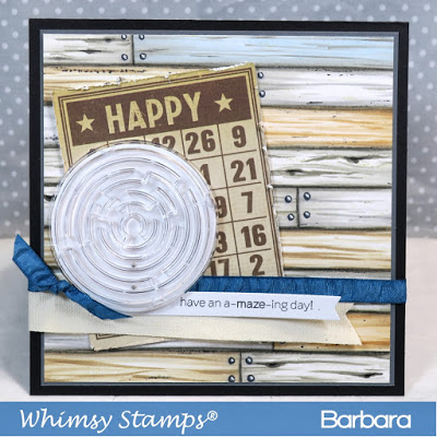 For my project I used and colored the Farmhouse Shiplap Background from Whimsy Stamps. I wanted to go for a re-purposed look so I colored the planks different shades of gray, brown and even one or two of them blue. I also added seams with nails. I thought the background was good enough for a card so I skipped coloring a character to put on top of it. I simply added a few odds and ends to create this fun maze card.