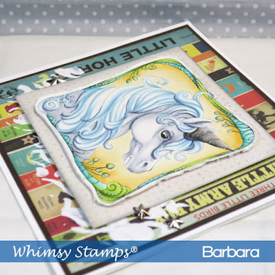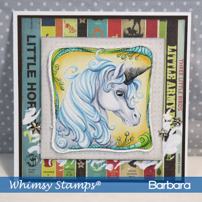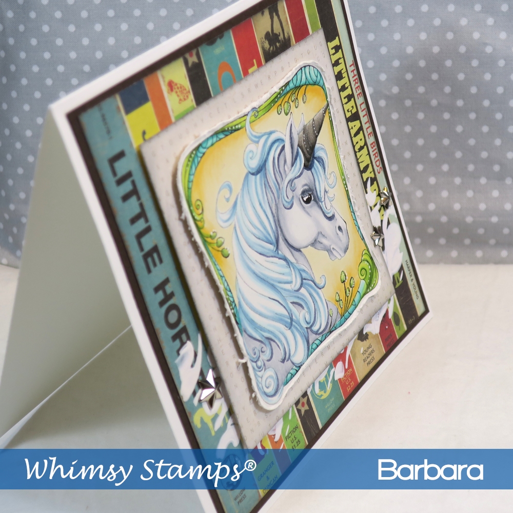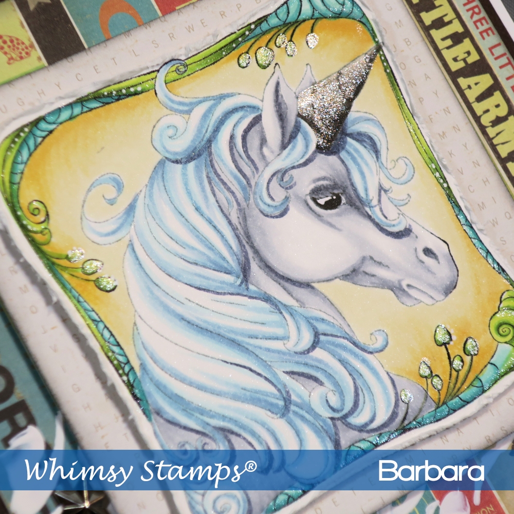 Welcome to the April release from Whimsy Stamps! This is Day 1 and I have a project that features the Unicorn Framed rubber stamp. In the background, I’ve also used the Swish Stencil with white gesso because I wanted a horizontal elements but didn’t want to use ribbon, which I typically use.
