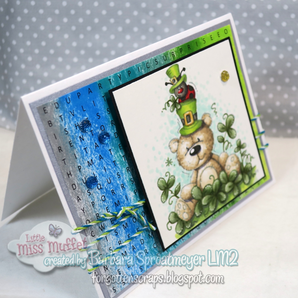 I’m pretending to be super-early for next year’s St. Patrick’s day instead of admitting that I was late again. LOL But I was in the mood for green and this stamp fit the bill. This is Theodore’s Shamrocks rubber stamp from Little Miss Muffet Stamps. The background is Word Search Birthday Sentiments digital stamp also from Little Miss Muffet Stamps which was colored with Distress inks.