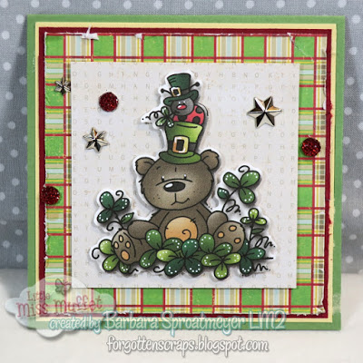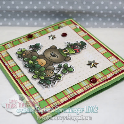 I know it was just a couple days ago that I posted a project using this same stamp but I was compelled to use it again. This is actually the label from the Theodore’s Shamrocks rubber stamp package from Little Miss Muffet Stamps. As I was opening up the package, I could toss it out and thought it would make an excellent little note card.