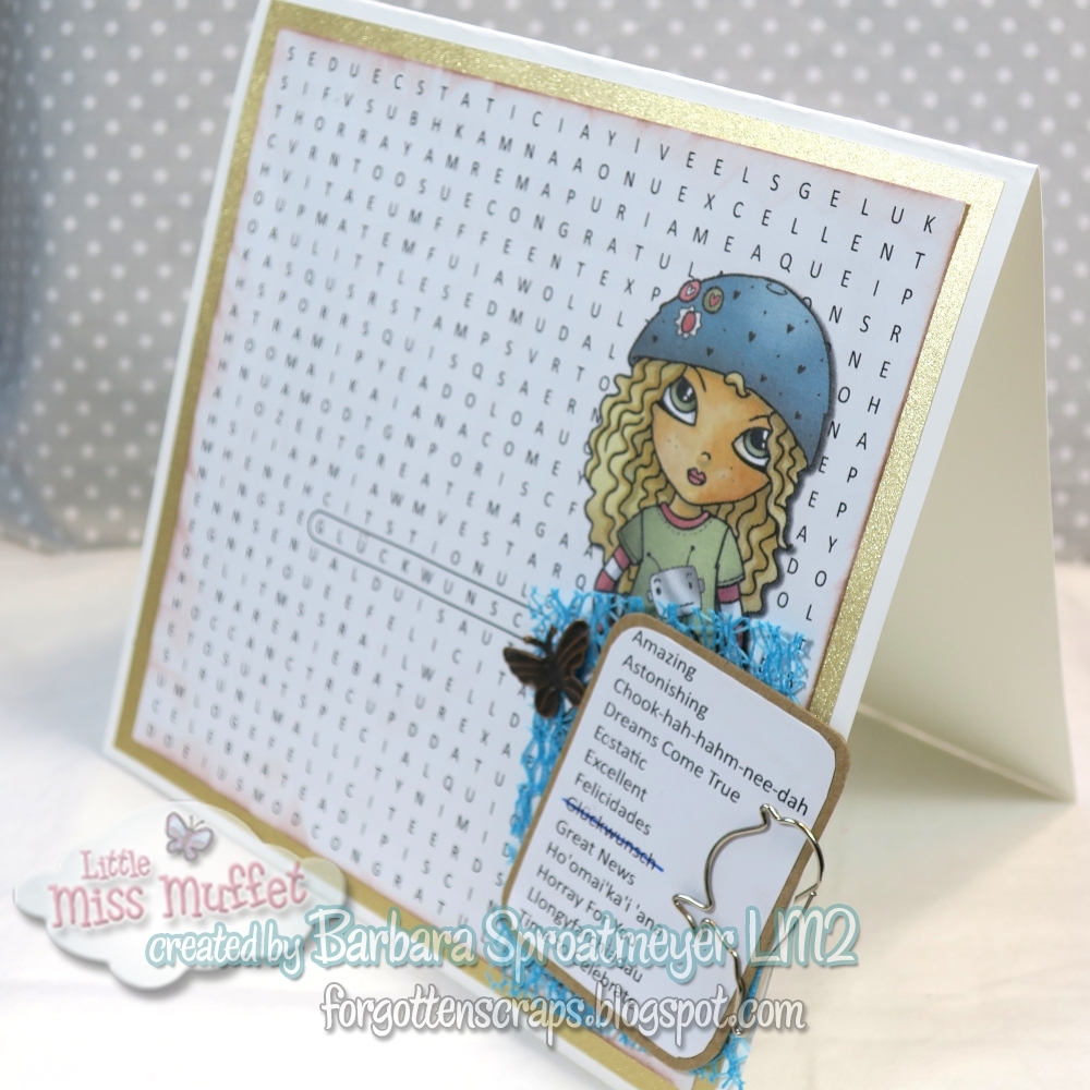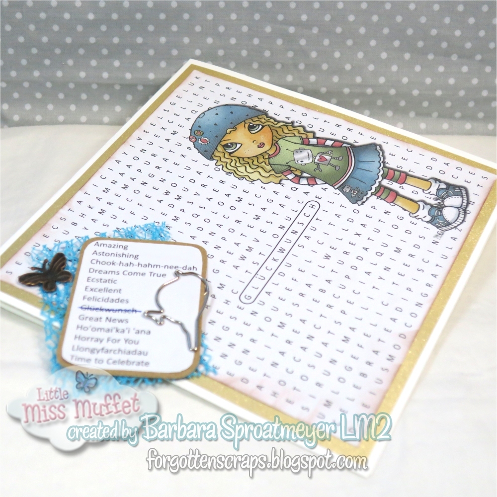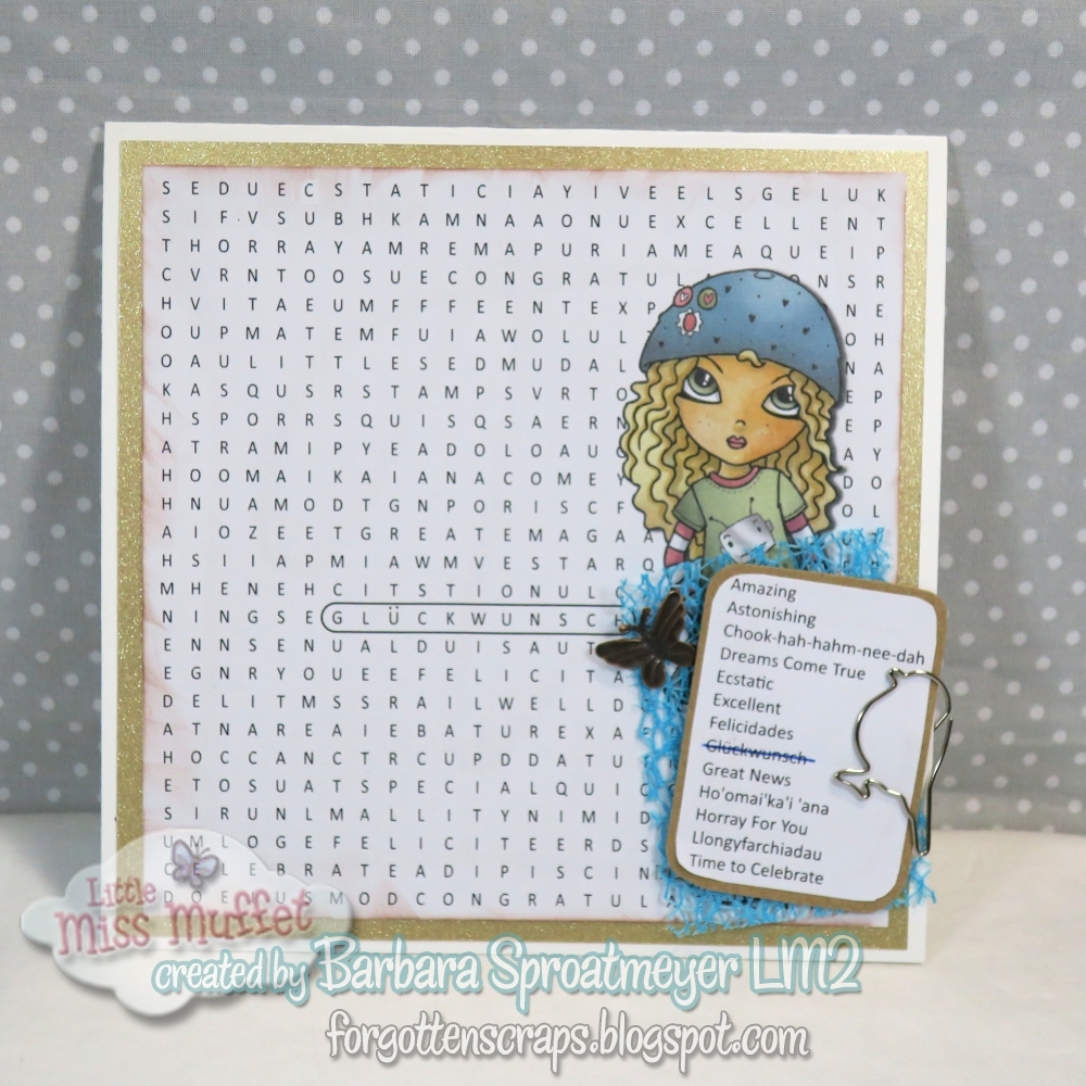 I thought it would be fun to give a challenge on a card. So I used Luna Bitterfrost Robot Rocks and Word Search Congratulations Sentiment by Little Miss Muffet Stamps. I used the included word list to give the recipient of this card some words to hunt for on her own. I circled the first one, Glückwunsch which is Congratulations in German. I added the umlaut on the word search background. Now she’ll have to find the rest of the words and there are some others in there too. Good luck!