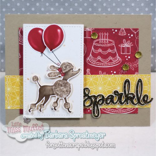 I’ve used the Birthday Memories designer series papers from Stampin’ Up! to create this project and followed a card layout and idea from DO Stamping with Dawn. I also used some Make it Crafty chipboard embellishments for the sentiment and added some gems for sparkle. When I created the card, I forgot to double-look when I placed the balloons so they are tied to the poodle’s head instead of the tail; which was been a better idea. LOL