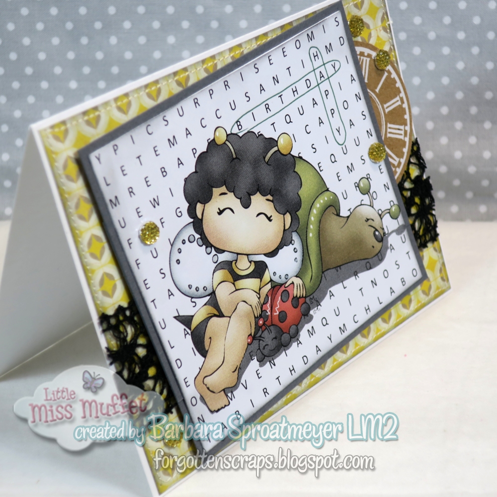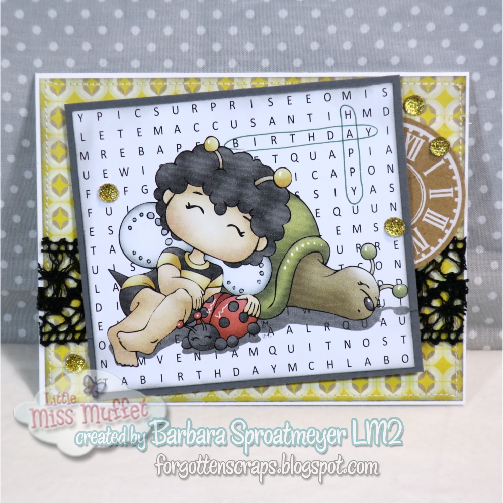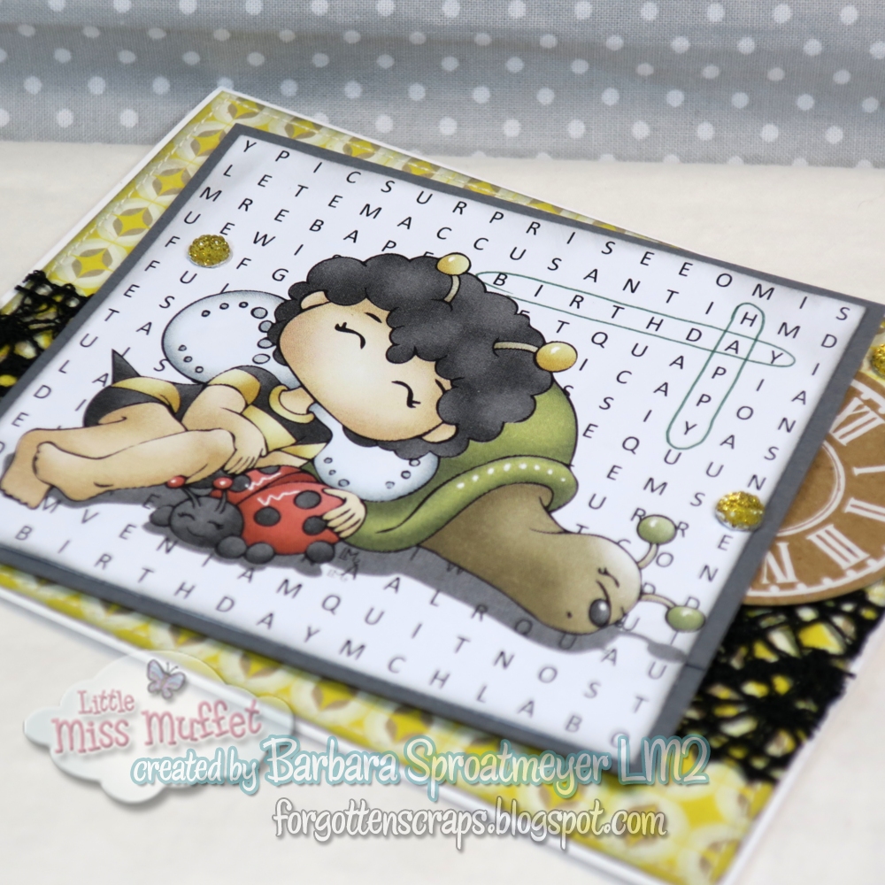 I’ve joined the hop with my bee themed creation!  For my project I’ve used Polka Dot Pals Xara and in the background is Word Search Birthday Sentiment, both from Little Miss Muffet Stamps. You’ll find Polka Dot Pals Xara as a freebie during this hop as part of the celebration. On the background, I circled the words Happy Birthday in the word search.
