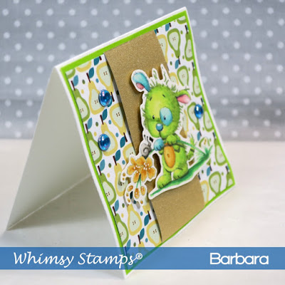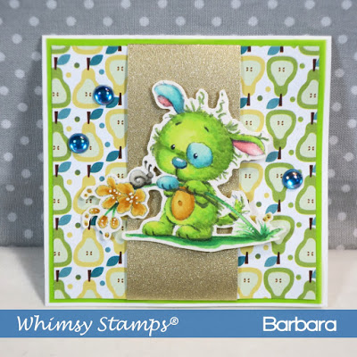 Here’s another little note card using one of the puppies from the Naughty Puppies set from Whimsy Stamps. He’s backed by some of the Whimsy Stamps glitter and transparent paper in the background plus some fruit paper I had in my stash. I colored the other two puppies from this set in normal puppy colors so I decided to go for a green one this time. 😀