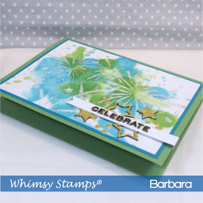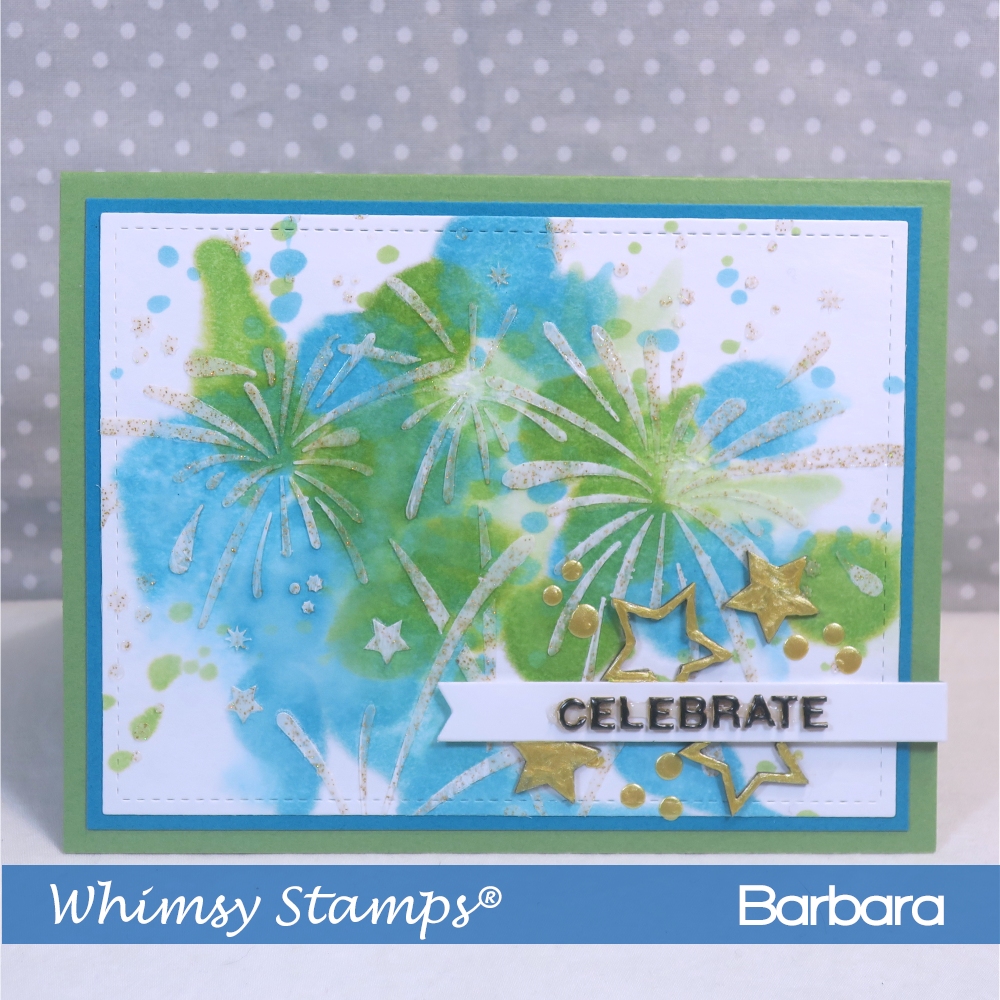 For my project today, I decided to try a technique from Sue. I wasn’t sure what paper to use and didn’t have what she suggested so I just grabbed what paper I had. However, the paper absorbed the ink refills too quickly. But I’m not one to waste so I made a card with it anyway and used the Fireworks Stencil (from Whimsy Stamps) to add some texture.