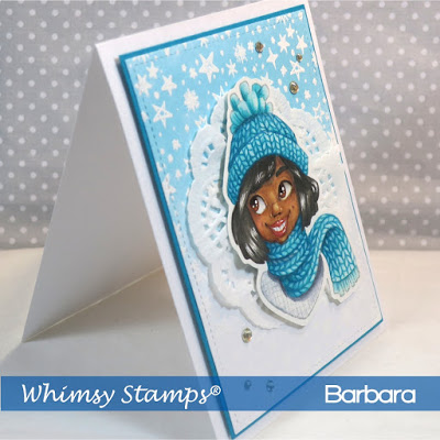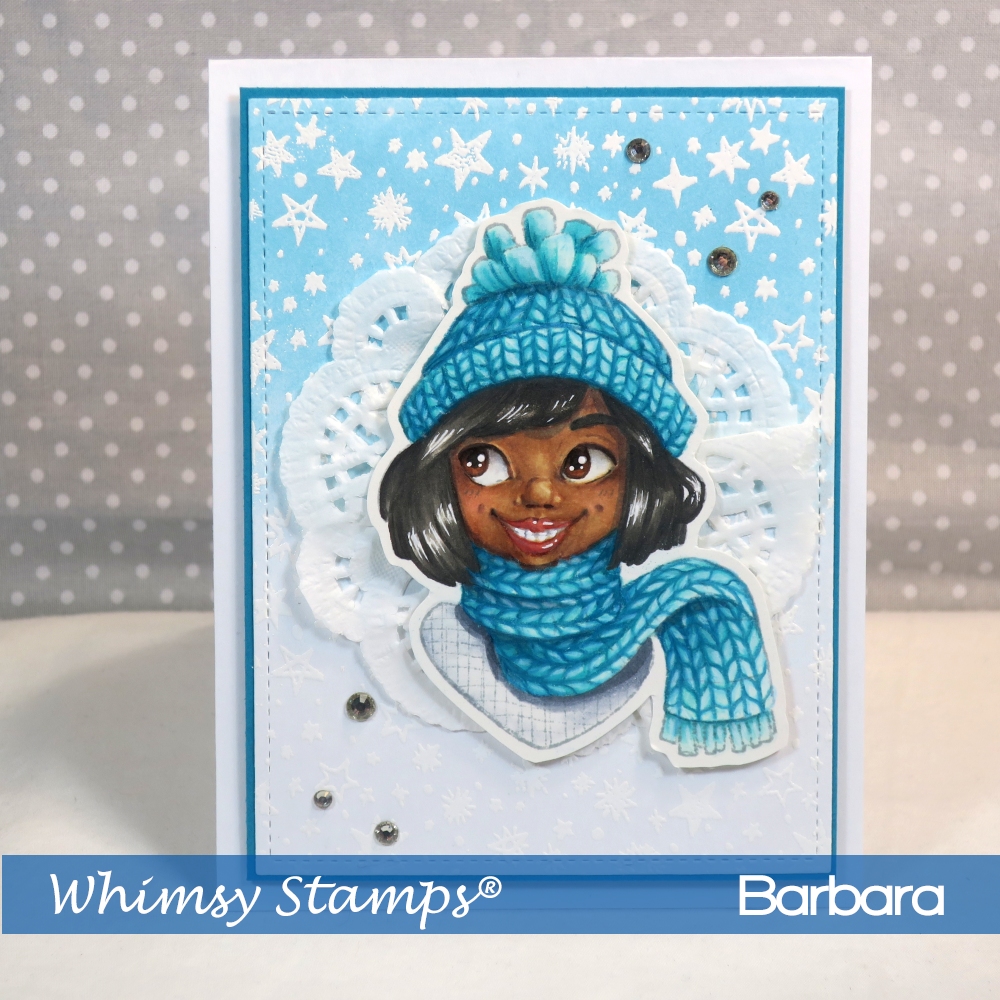 It’s a new release at Whimsy Stamps and I’ve created a card using the new Galaxy Galore Background along with the Bundled Up stamp in the foreground. There are loads of other inspiration from the Whimsy DT this week.