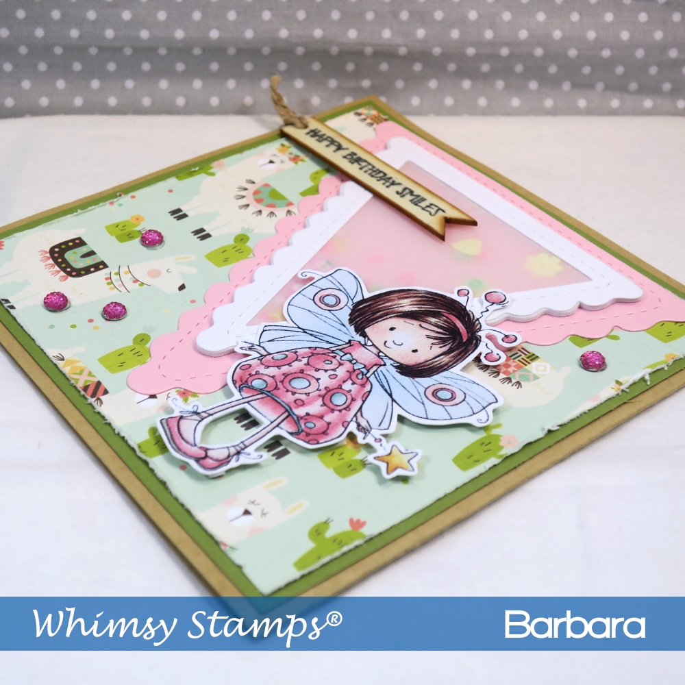 I’ve used the label from Mazarine Butterfly Fairy rubber stamp which was originally colored by Bev. She did such an awesome job and it fit perfectly with the papers I wanted to use. I then stamped a portion of a sentiment from Magical Birthday Wishes and used the Shaker Maker Pennant Flags die set for a shaker element.